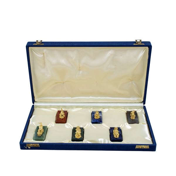 4x6x3 cm. cad.cesellati a raffigurare animali e volatili, poggianti su basi in marmi policromi, entro custodia