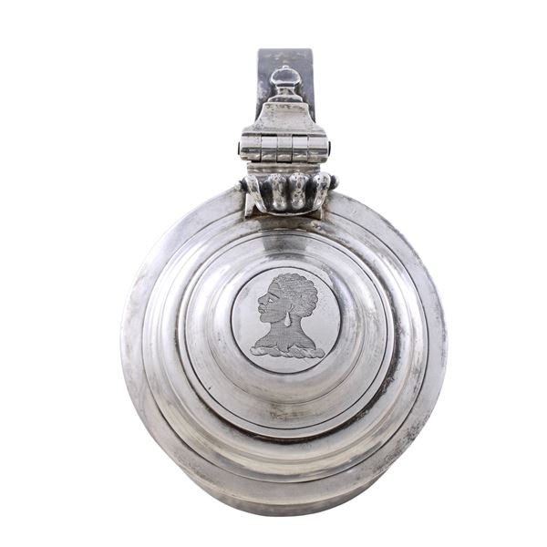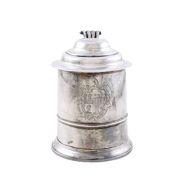 h. 20 cm.orafo John Bache, corpo liscio con profili e bordi godronati, centrato da un'incisione raffigurante uno stemma araldico, manico sagomato, peso 910 gr.