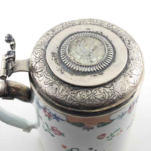 h. 17,5 cm.corpo in porcellana decorata con motivi floreali, coperchio in argento cesellato con volute vegetali, difetti