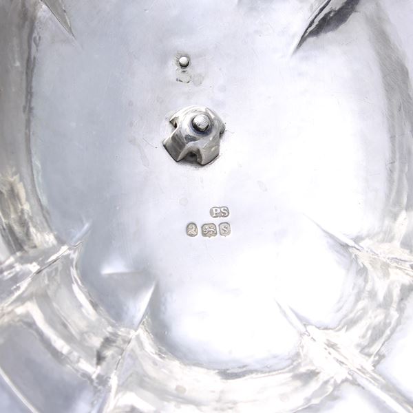 zuppiera 24x49x37 cm. - pressentoire 49x38 cm.orafo Paul Storr, corpo di sbalzato con bordo ornato da baccellature, manici laterali a foggia di volute vegetali intrecciate, presa del coperchio a foggia di levriero, piedini a riccio, completa di présentoire con analoga decorazione, Londra 1826, orafo John Bridge, peso complessivo 5430 gr.