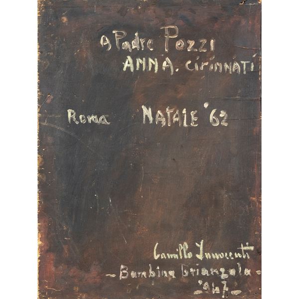 40x30 cm."Bambina Brianzola", 1947, olio su tavola, firmato in basso a sinistra, firmato, datato e titolato sul retro, entro cornice