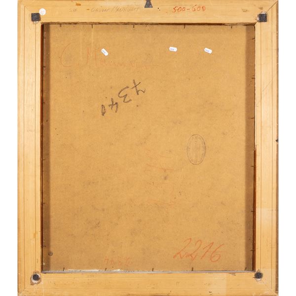 80x71 cm."Donna con bambino e cesta di frutta", olio su masonite, firmato in basso a sinistra, entro cornice