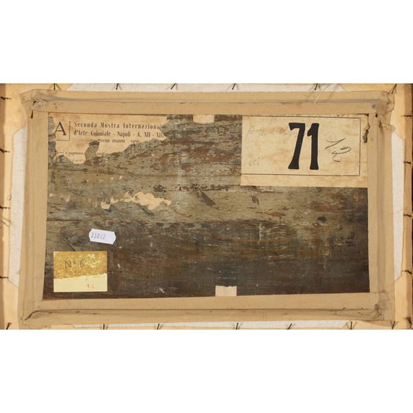 20x34 cm."Thana Jun" 1922, olio su tavola, firmato in basso a sinistra, titolo e data in basso a destra, entro cornice, sul retro reca frammento di cartiglio della seconda mostra internazionale arte coloniale 1934, Napoli