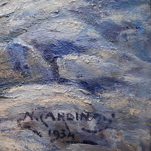 "Paesaggio montano", 1934, olio su cartone, firmato e datato in basso a destra, entro cornice