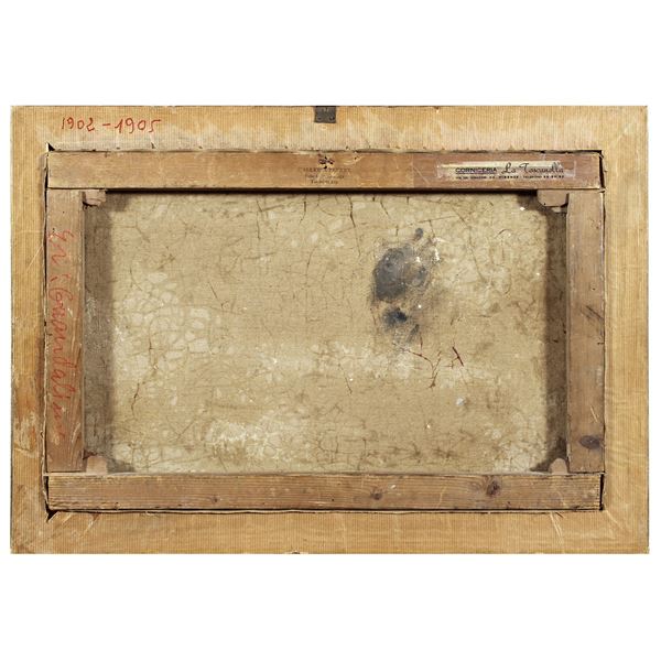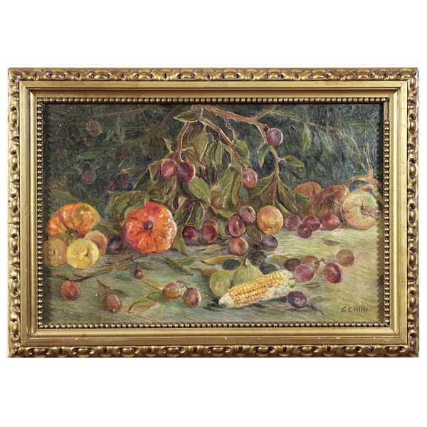 35x55 cm."Natura morta con uva, pomodori, prugne, cipolle e pannocchia", olio su tela, reca firma G. Chini in basso a destra, entro cornice