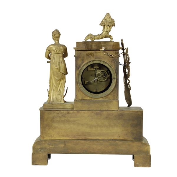 41x31x9,5 cm.quadrante circolare con numeri romani sormontato da una cornucopia con terminale a testa d'ariete, ai lati una figura femminile con ancora e insegna con motivi marini, base rettangolare decorata con una scena mitologica, difetti