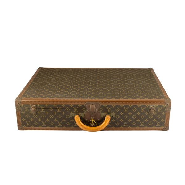 75x50x17 cm.in tela monogram con manico in pelle, finiture in cuoio e in ottone dorato, interno ad uno scomparto con cinte regolabili per indumenti, chiusura con lucchetto centrale completo di chiavi e due lucchetti laterali