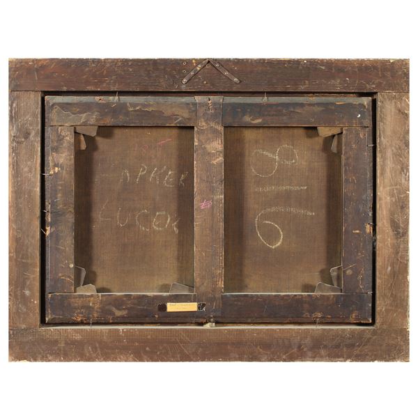 42x61 cm."Scena di villaggio con figure", olio su tela, entro cornice