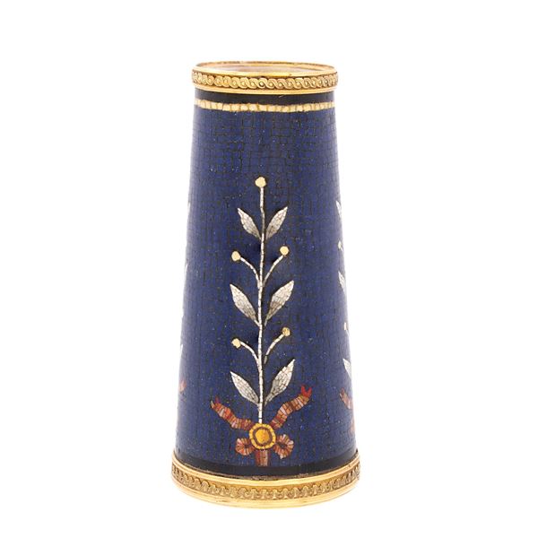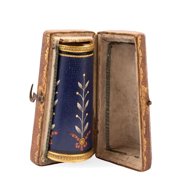 8x3,8 cm.corpo cilindrico, decorato con motivi naturalistici e da una placca circolare profilata in oro giallo e raffigurante un cardellino su un ramo, entro custodia