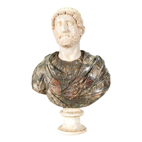59x40x18 cm. - 53x38x18 cm.raffiguranti gli Imperatori Traiano e Adriano, realizzati in marmo africano e bianco di Carrara