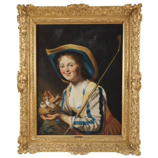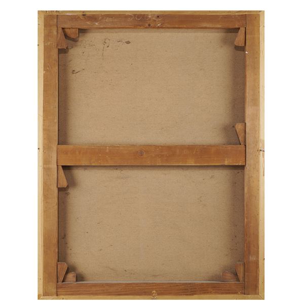 85x65 cm."Figura femminile con nido di colombe tra le mani", olio su tela, entro cornice