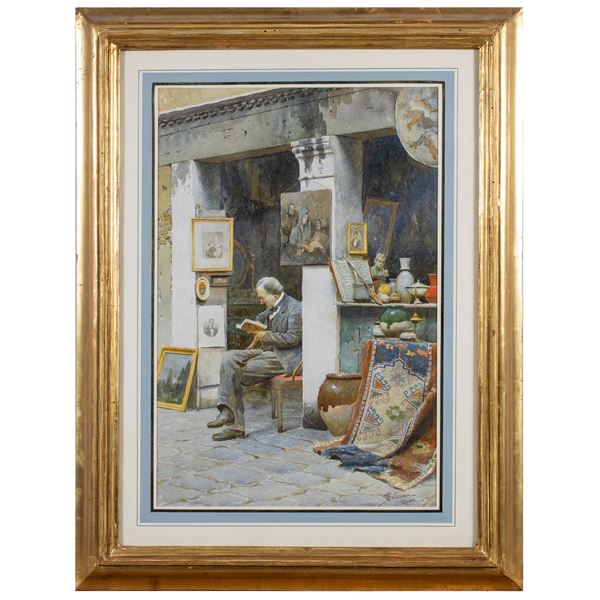 45x30 cm."L'antiquario", acquerello su carta, firmato in basso a destra, entro cornice