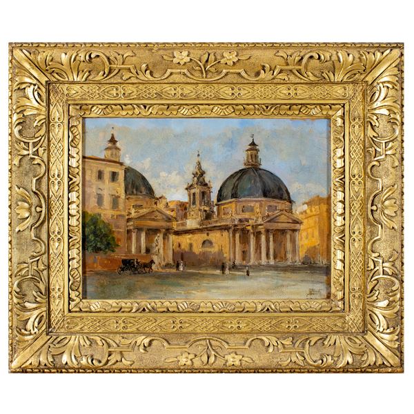 25x35 cm."Piazza del Popolo", 1919, olio su cartone, reca firma Filippo Anivitti in basso a destra, entro cornice