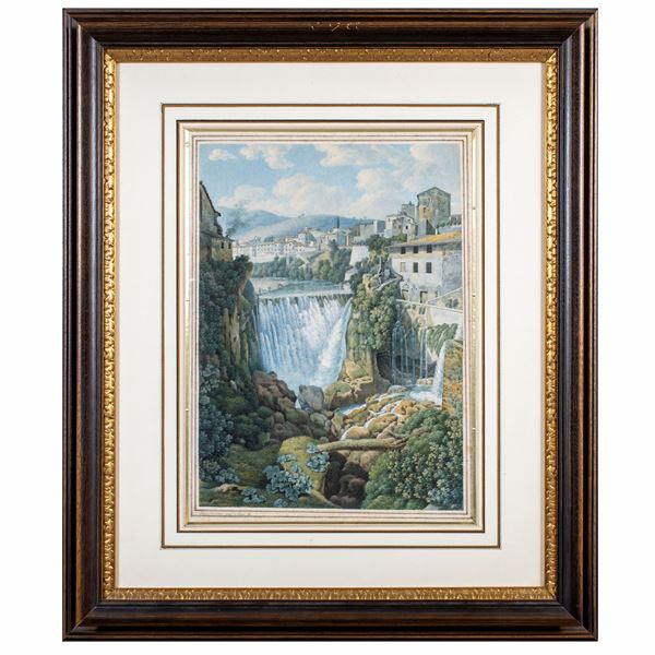 40x30 cm."Veduta delle cascate di Tivoli", 1795, acquerello su carta, firmato e datato in basso a sinistra, entro cornice