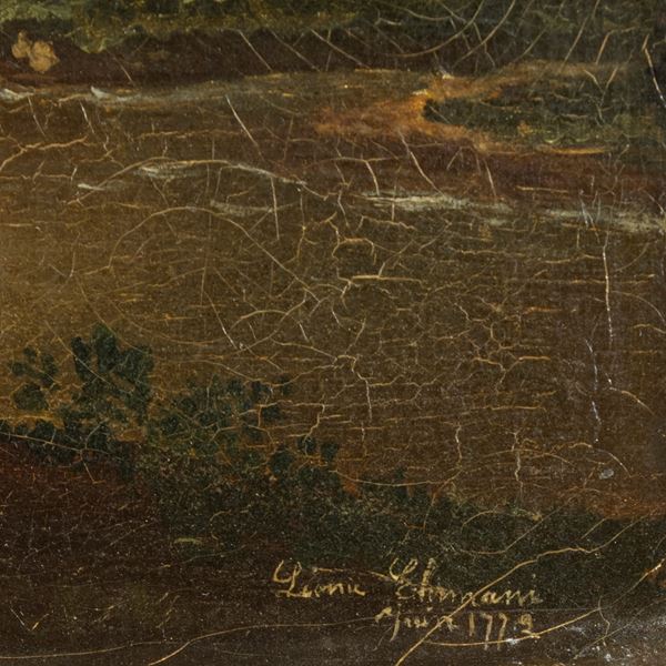 59x43 cm."Paesaggio con figure", 1779, olio su tela, firmato e datato in basso a destra, entro cornice