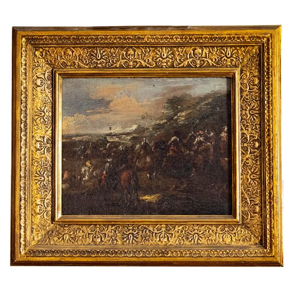 19,5x24,5 cm."Scene di battaglia con cavalieri", coppia di oli su tela, entro cornici
