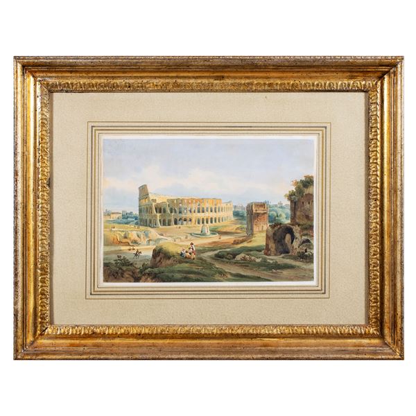 24x34 cm."Veduta del Colosseo", 1845, acquerello su carta, firmato e datato in basso a destra, entro cornice