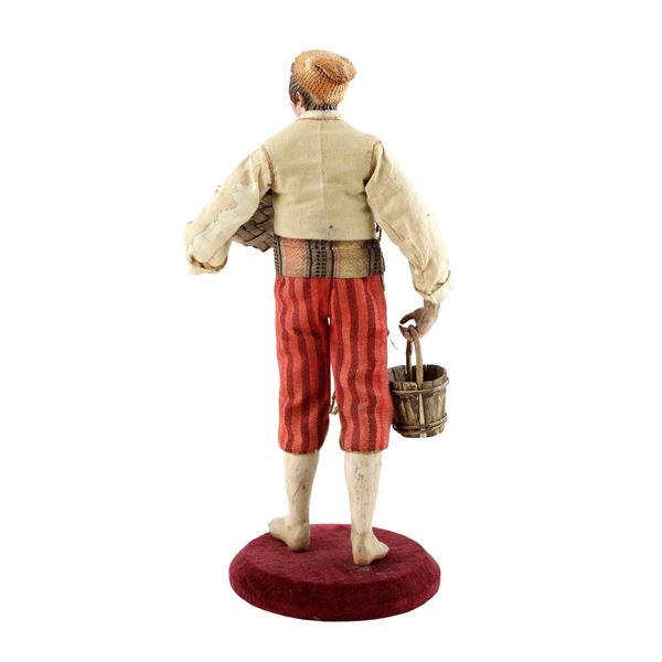 h. 33 cm."Pescivendolo", scultura da presepe in terracotta policroma, legno e tessuto, poggiante su base circolare, lievi difetti, entro custodia