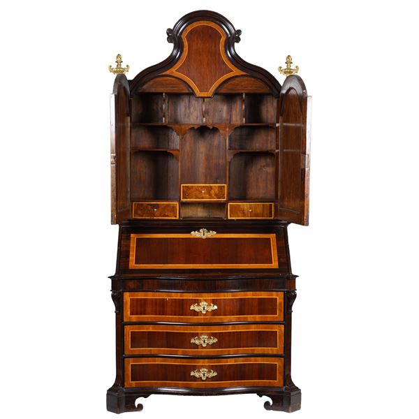 Parte inferiore di linea mossa con fronte a calatoia con all'interno cassetti, scomparti e vani segreti, tre cassetti sottostanti con bocchette in bronzo dorato e cesellato, base modanata, piedi a mensola, lievi mancanze alla lastronatura