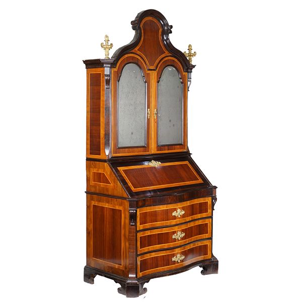 248x116x70 cm.filettato in legno di bosso, parte superiore con cimasa sagomata, ai lati due pinnacoli a forma di vaso in bronzo dorato e cesellato, fronte a due sportelli con specchi centinati, all'interno cassetti e vani a giorno.