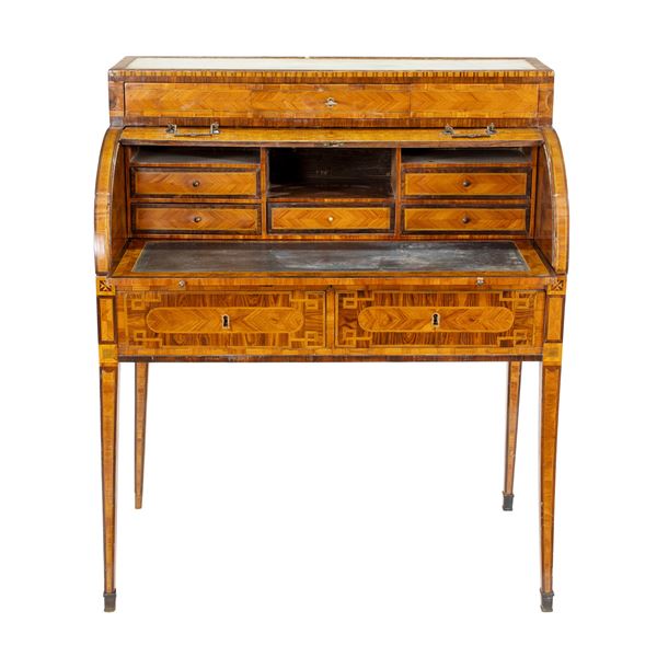 117x98x55 cm.lastronato ed intarsiato in legni vari, fronte a cinque cassetti con apertura scorrevole celante tiretti e scomparti vari, piano scrittoio estraibile parzialmente rivestito in pelle, maniglie e piedini in bronzo, piano in marmo bianco, lievi difetti