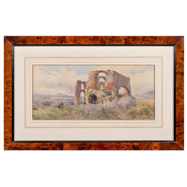 22x50 cm."Veduta della campagna romana con rovine", acquerello su carta, firmato in basso a destra, entro cornice