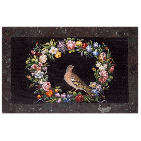 di forma rettangolare raffigurante un cardellino all'interno di una ghirlanda floreale