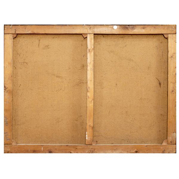 71x97 cm."Scena di mercato con sfondo della chiesa di San Sebastiano al Palatino e il Colosseo", olio su tela, firmato in basso a destra, entro cornice