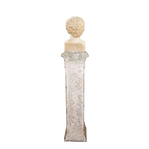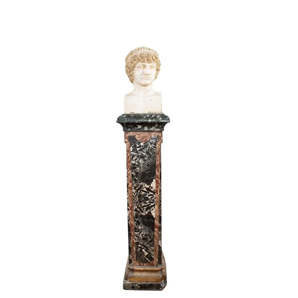 170x37x31 cm.raffigurante busto di Antinoo poggiante su erma in breccia verde, bianco e nero d' Aquitania e alabastro fiorito