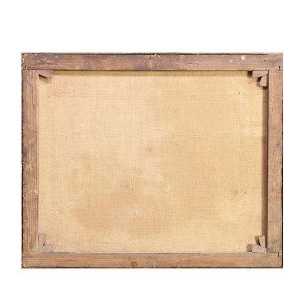 55x68 cm."Paesaggio campestre con figure ", olio su tela, entro cornice