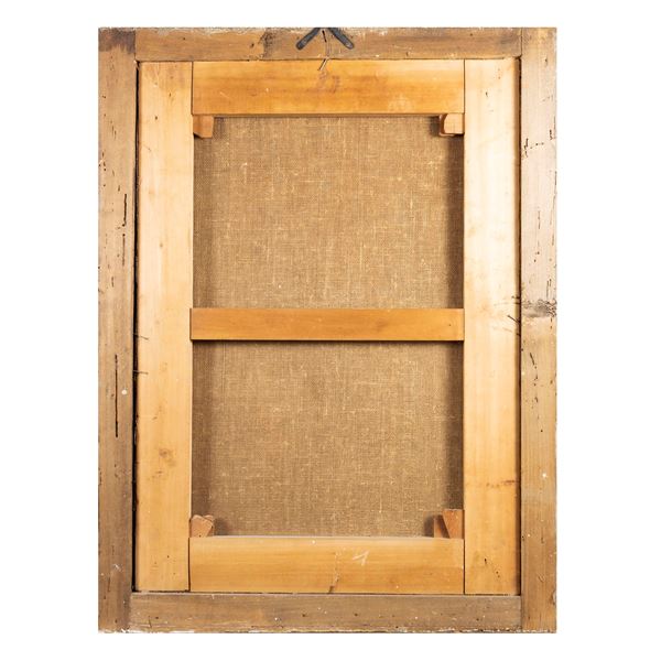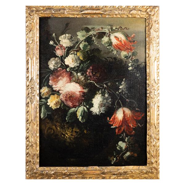 63x45,5 cm."Natura morta con vaso di fiori", olio su tela, entro cornice