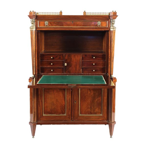 157x106x48 cm.parte superiore con un cassetto e calatoia celante scomparti e tiretti vari, parte inferiore a due ante, ringhierina ed applicazioni antropomorfe in bronzo dorato, piedi troncopiramidali