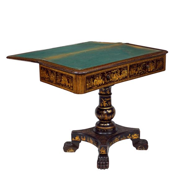 74x87x43 cm. chiusodecorato in oro con paesaggi, personaggi e motivi vegetali, piano apribile parzialmente rivestito in panno verde, poggiante su sostegno tornito su base sagomata, terminali ferini
