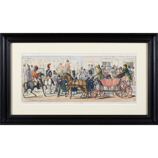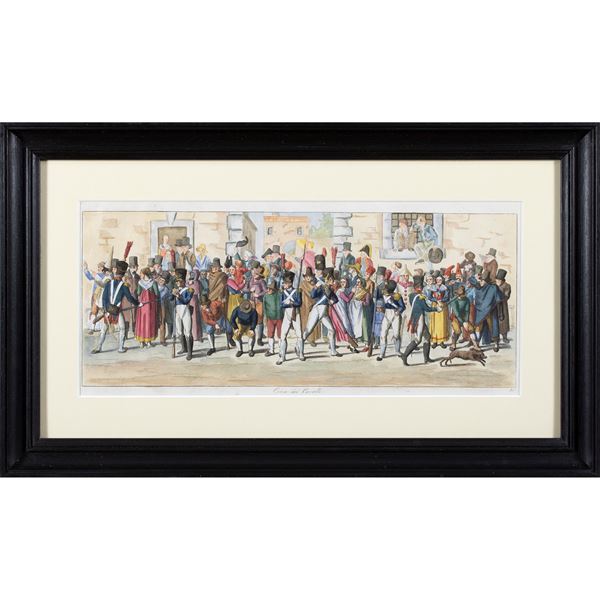 21x46 cm."Corsa dei Cavalli - I Moccoletti", 1820, coppia di acqueforti acquarellate, entro cornici