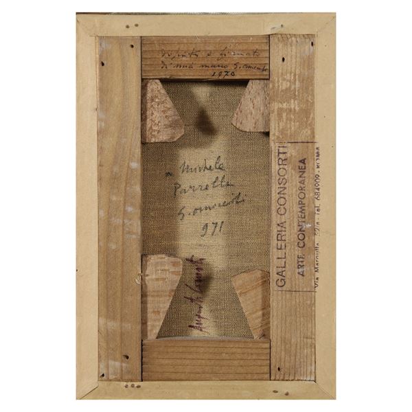 21x14 cm."Vaso di fiori", 1971, olio su tela, firmato in basso a sinistra e sul retro, entro cornice