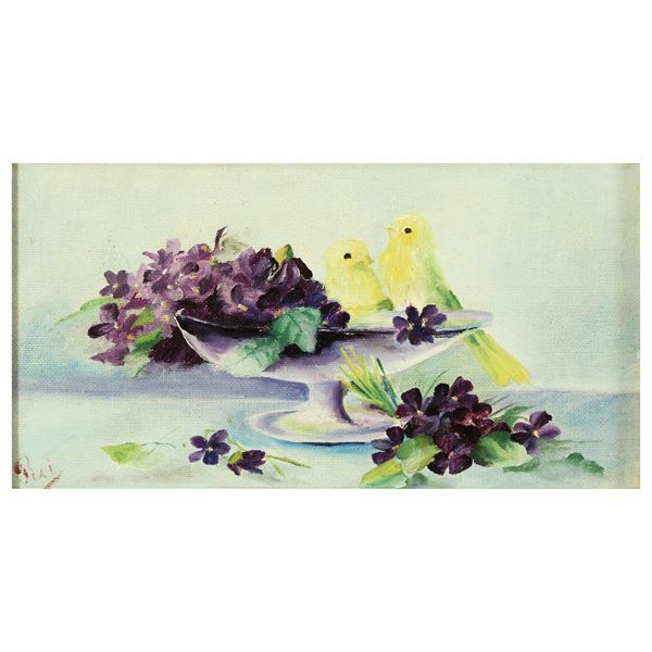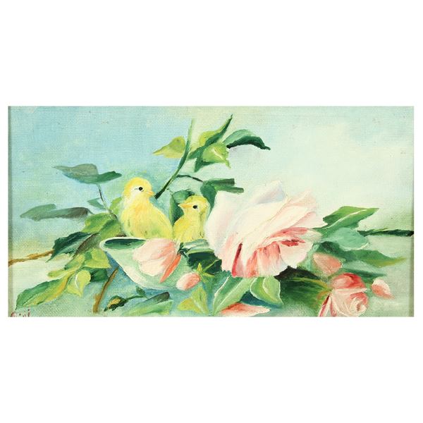 19,5x35 cm."Nature morte con canarini", coppia di oli su tela applicati su tavola, entro cornici