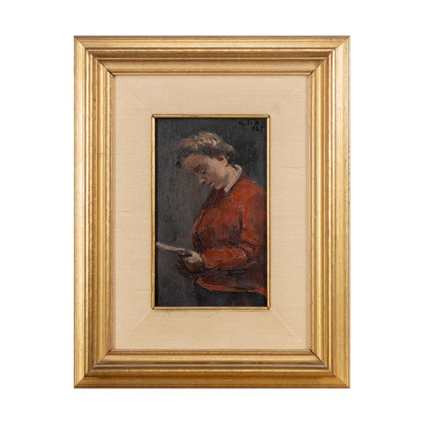 17,5x10 cm."La lettera", 1947, olio su tavola, firmato e datato in alto a destra, entro cornice