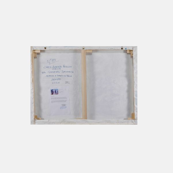 80x110 cm."Gioventù spezzata", 2024, acrilico e smalti su tela, firmato e datato in basso a destra, titolato e datato sul retro
