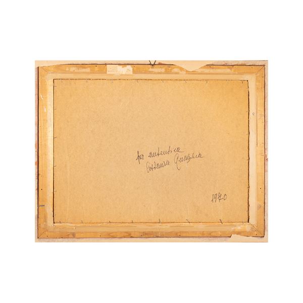 59x80 cm."Ponte Milvio", 1970, olio su masonite, firmato e datato per autentica sul retro, entro cornice