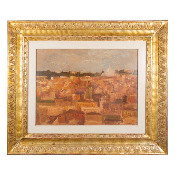 45x60 cm."Veduta di Roma", anni 60, olio su faesite, firmato in basso a destra, firmato e datato sul retro per autentica dalla figlia Costanza Quaglia e datato 20/04/1973, entro cornice