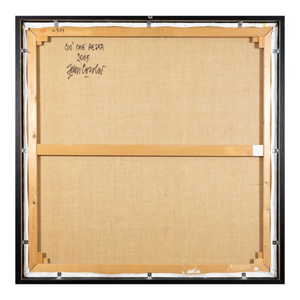 100x100 cm."Ciò che resta", 2005, tecnica mista su tela, firmata in basso al centro, firmata, datata e titolata sul retro, entro cornice.