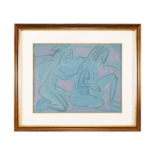 35,5x46 cm."Zwei Knieende Madchenakte", 1920, tecnica mista su carta blu, firmata in basso a destra, timbro dell'artista "E.L. Kirchner Nachlass" sul retro, entro cornice.