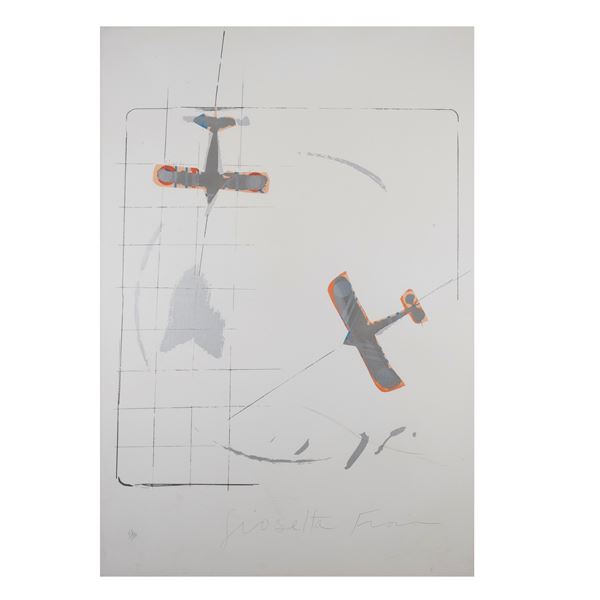 100x70 cm."Senza titolo", litografia, es. 51/100, firmata in basso a destra, timbro a secco dell'artista, entro cornice