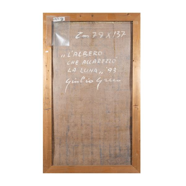 137x79 cm."L'albero che accarezza la luna", 1993, pittura su tela, firmata, datata e titolata sul retro, entro cornice.