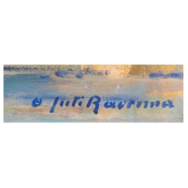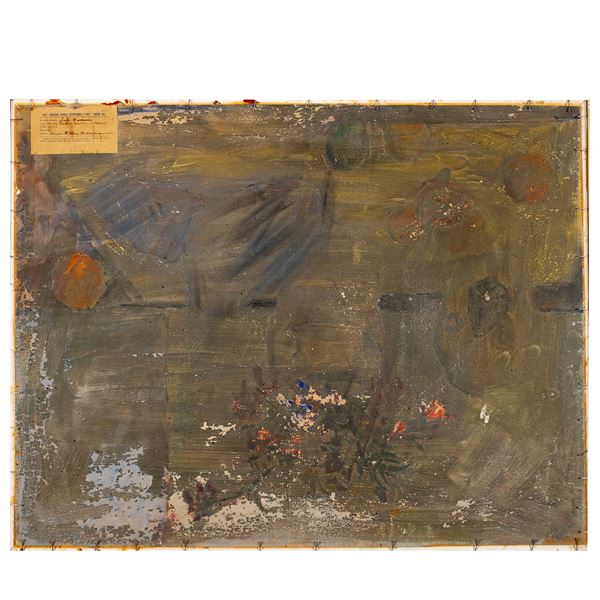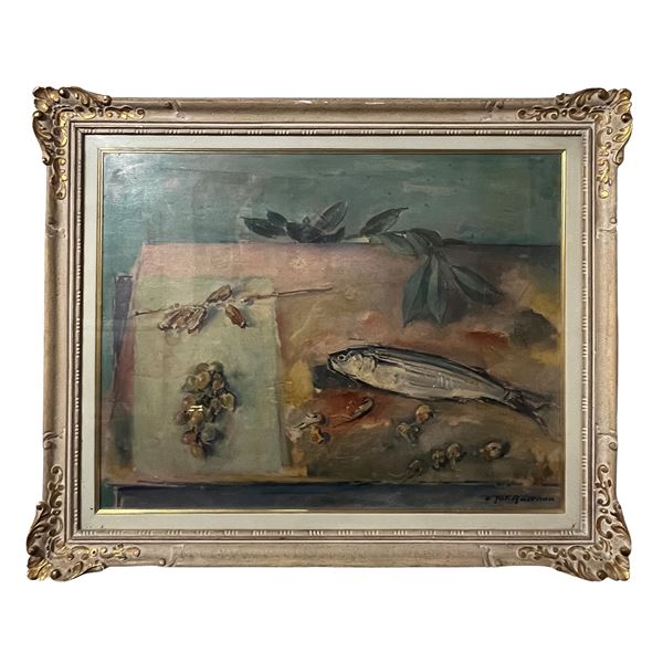 58,5x75,5 cm."Natura morta con pesce", 1930 circa, olio su compensato, firmato in basso a destra, entro cornice.