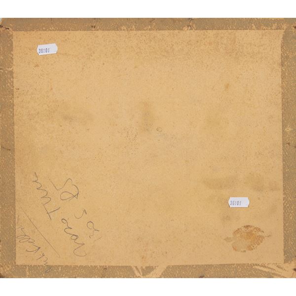 31,5x36,7 cm."Darsena vecchia", olio su cartoncino, firmato in basso a destra, entro cornice