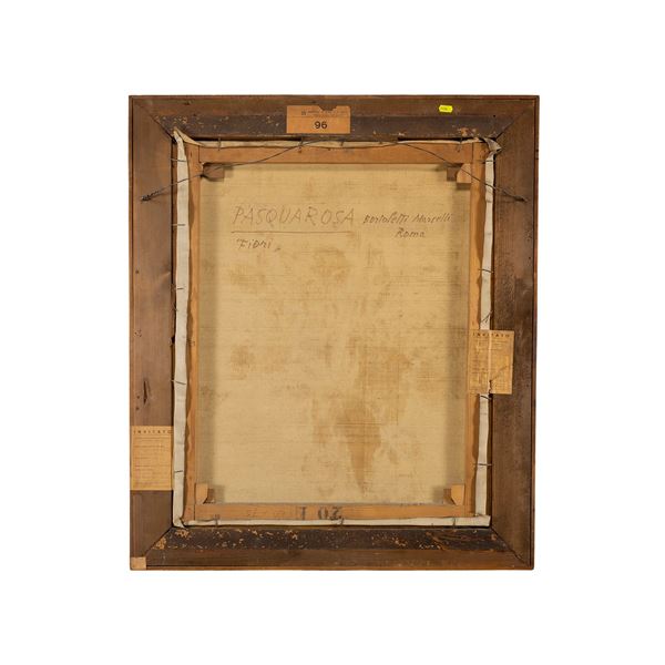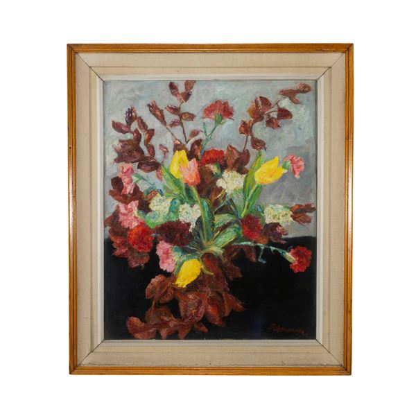 75x61 cm."Fiori", olio su tela, firmato in basso a destra, firmato e titolato sul retro, entro cornice