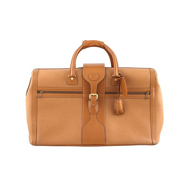 misure 60x27x35 cm.in pelle, interno in tessuto, ad uno scomparto con tasca a zip, due tasche esterne a zip, chiusura a cerniera con fibbia, manico in pelle, completa di porta etichetta e lucchetto, all' interno busta Gucci portascarpe, lievi segni di usura