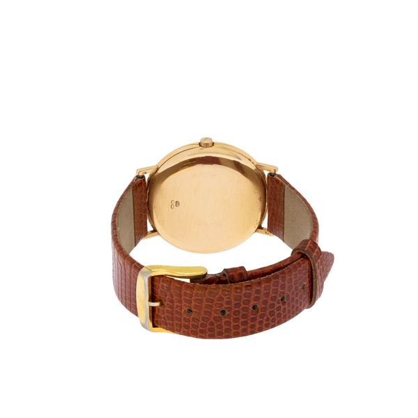 peso 29 gr.in oro giallo 18kt, ref. 1296 - 7687, cassa tonda 34 mm. quadrante argentato con indici, movimento meccanico a carica manuale, calibro 428, cinturino con fibbia in metallo dorato, cassa, quadrante e movimento firmati