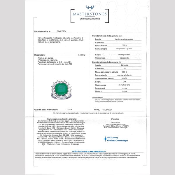 peso 9 gr.ct 7,50 circa contornato da diamanti taglio brillante ct 2 circa colore G/H - purezza VS/SI, misura 14,5, completo di certificato gemmologico